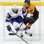 TRENCIN, SLOVAKIA, 29, Apr, 2026, U18 Men’s Worlds, GER vs. NOR. Image shows Tim HARTMANN #23 (Germany) & Chris LYSHOLM #10 (Norway). Photo: Werner Krainbucher