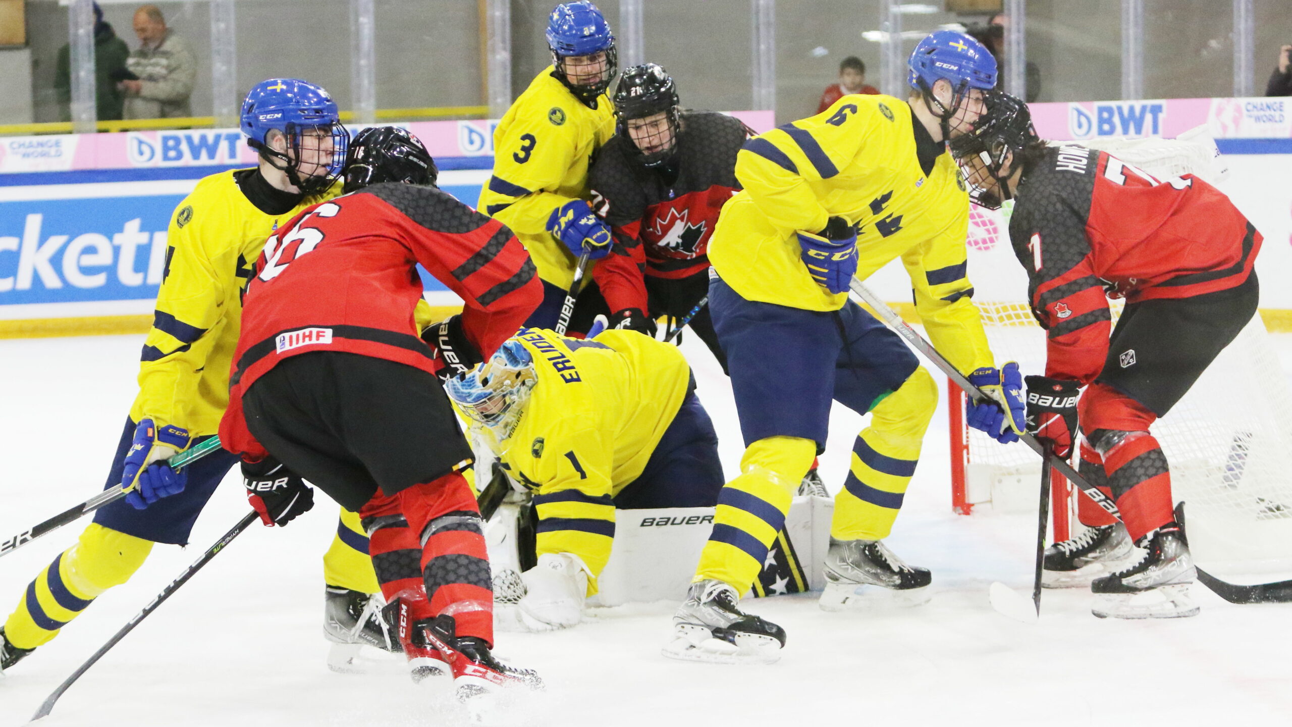6T4A8766 20. April 2023 2560 × 1440 Photo Gallery IIHF U18 World Championship CAN – SWE 0:8 IIHF U18 World Championship CAN – SWE Nick Lardis #16, Noah Erliden #1, Axel Landén #3, Calum Ritchie #21, Axel Hurtig #6, 18can07 #7 Raiffeisen Arena, Porrentruy (Ajoie) © Puckfans.at / Andreas Robanser