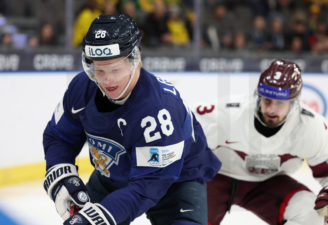 WK20231229_0369 29. Dezember 2023 1050 × 722 PHOTO GALLERY IIHF WORLD JUNIORS 2024 LAT -FIN 0:4 GOTHENBURG, SWEDEN, 29.Dec. 2023 – World Juniors, LAT vs. FIN. Image shows Jere LASSILA #28 (Finland) & Viktors KURBAKA #3 (Latvia). Photo: Werner Krainbucher