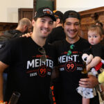 GRAZ, AUSTRIA, 26, Apr, 2026, Meisterfeier Graz 99ers. Image shows Marcus VELA #12 (Moser Medical Graz 99ers), Frank HORA #3 (Moser Medical Graz 99ers) and his daughter Mia. Photo: Werner Krainbucher
