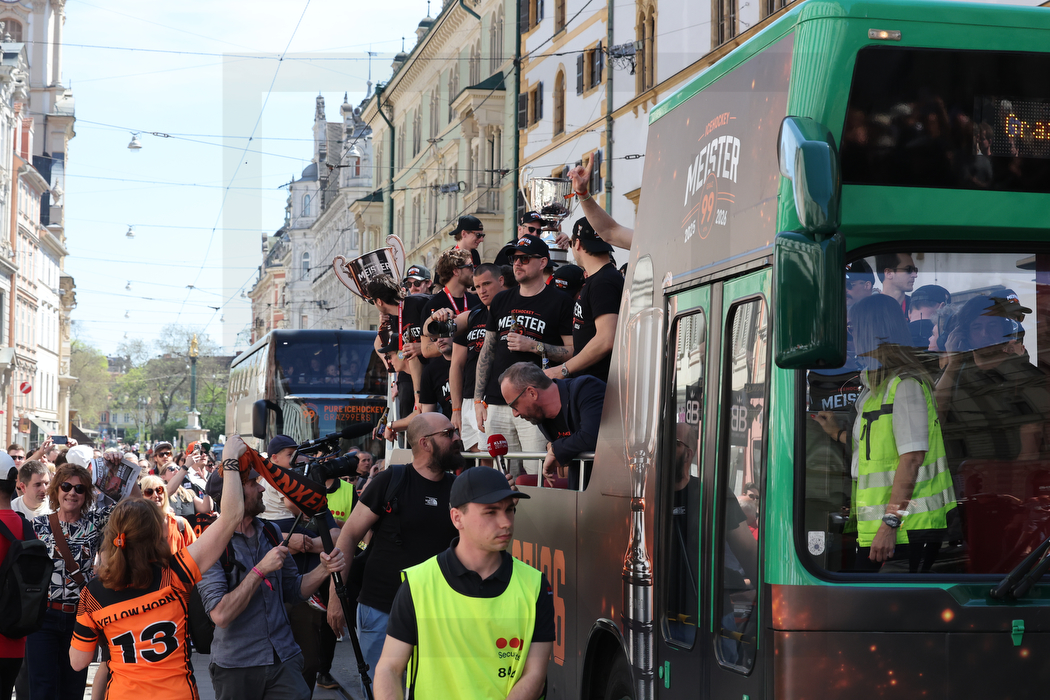GRAZ, AUSTRIA, 26, Apr, 2026, Meisterfeier Graz 99ers. Image shows 99ers in the open deck bus in the Herrengasse. Photo: Werner Krainbucher
