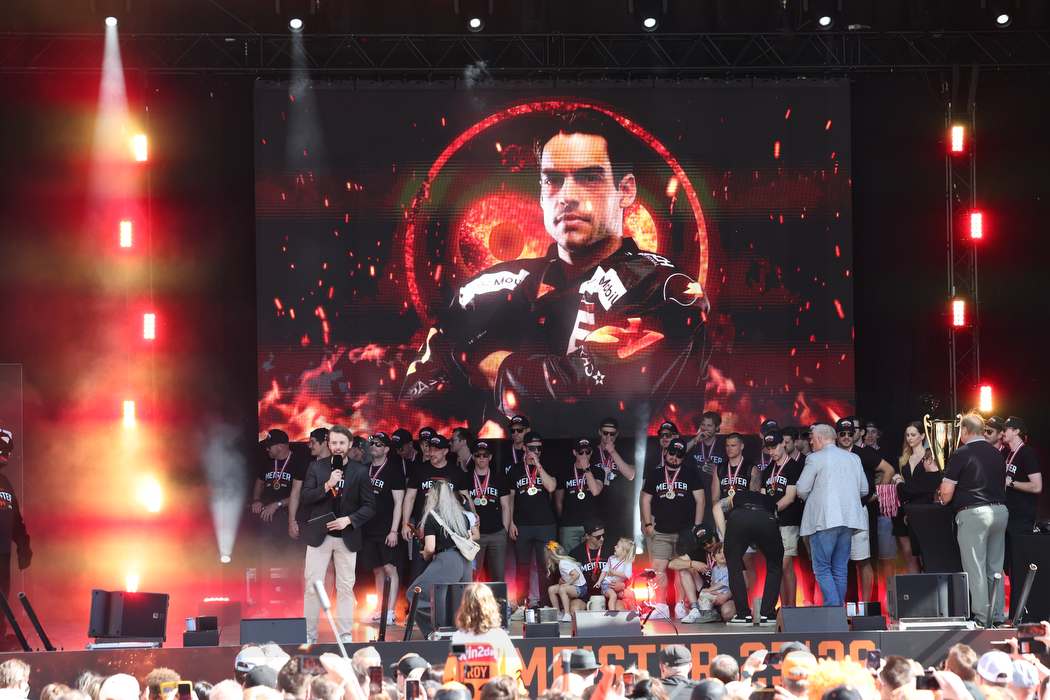 GRAZ, AUSTRIA, 26, Apr, 2026, Meisterfeier Graz 99ers. Image shows Chris Bauer making the moderation. Photo: Werner Krainbucher