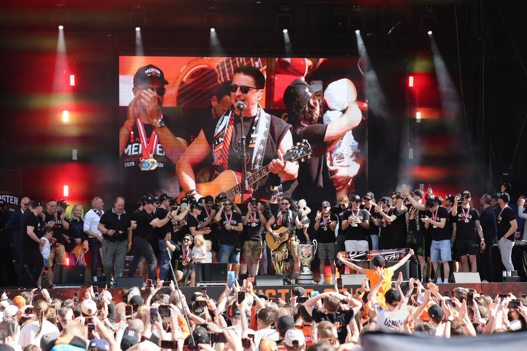 GRAZ, AUSTRIA, 26, Apr, 2026, Meisterfeier Graz 99ers. Image shows Andreas Gabalier sings a few songs for the team. Photo: Werner Krainbucher
