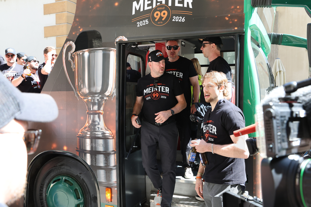 GRAZ, AUSTRIA, 26, Apr, 2026, Meisterfeier Graz 99ers. Image shows Daniel LACROIX, Head Coach (Moser Medical Graz 99ers) arriving at the city hall. Photo: Werner Krainbucher