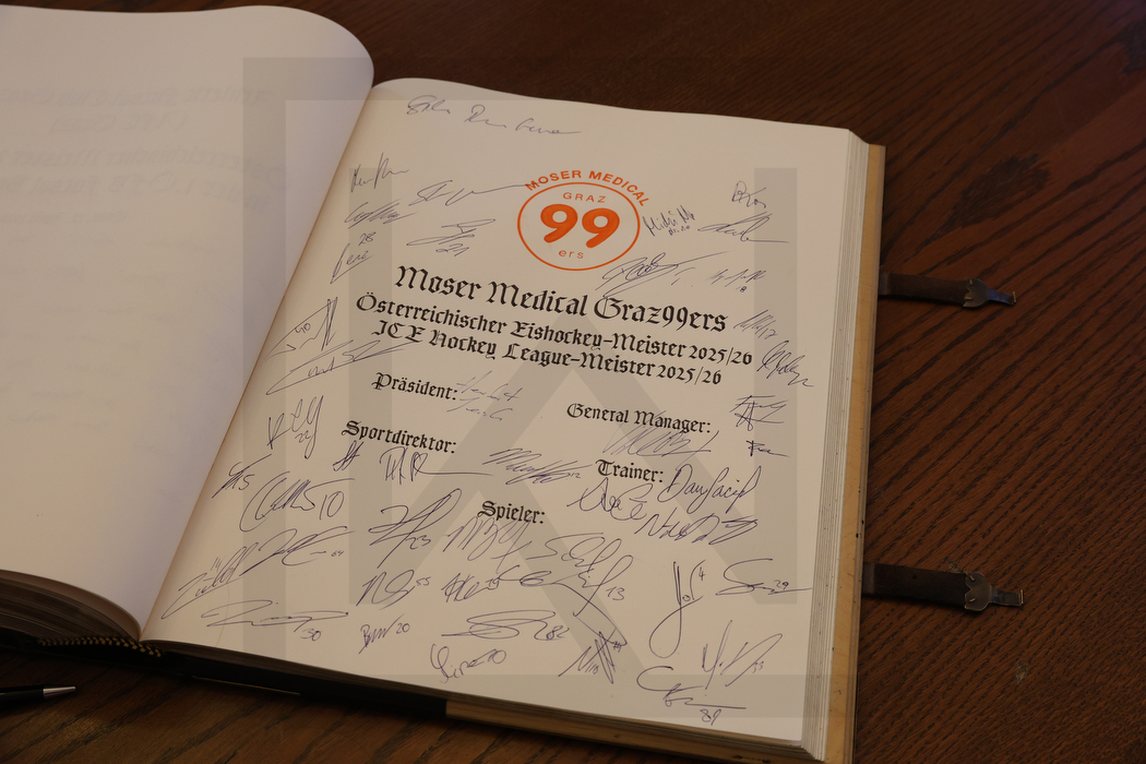 GRAZ, AUSTRIA, 26, Apr, 2026, Meisterfeier Graz 99ers. Image shows the golden book of the city with all the signatures of the team. Photo: Werner Krainbucher