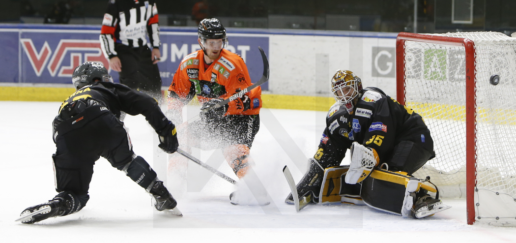 GRAZ, AUSTRIA, 26.Nov. 2021 – Moser Medical Graz 99ers vs. HC Pustertal Wölfe. Image shows Shane Robert HANNA #60 (HC Pustertal Wölfe), Simon HJALMARSSON #11 (Moser Medical Graz 99ers) & Thomas SHOLL #35 (HC Pustertal Wölfe). Photo: Werner Krainbucher