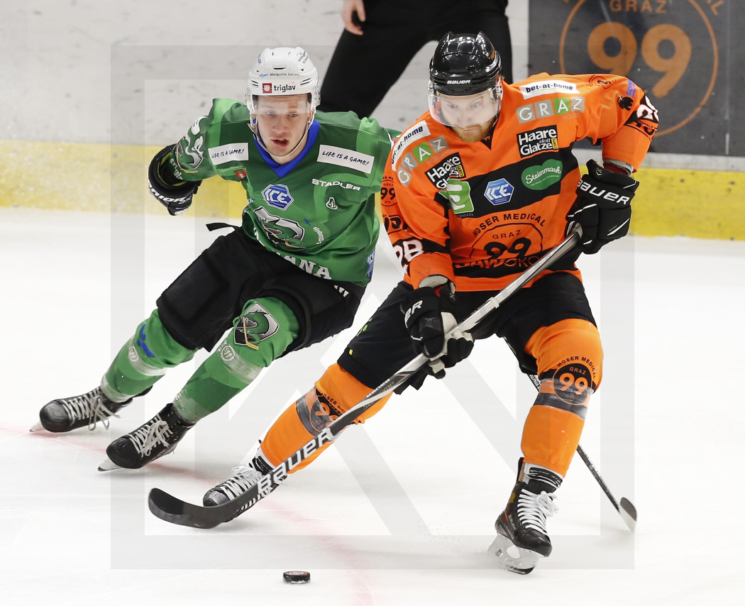 WK20220114_0070 14. Januar 2022 1050 × 854 Photo Gallery Round 38 Graz99ers – HK Olimpija Ljubljana 4:1 GRAZ, AUSTRIA, 14.Jan. 2022 – Moser Medical Graz 99ers vs. HK SZ Olimpija. Image shows Blaz TOMAZEVIC #98 (HK SZ Olimpija) & Michael BOIVIN #28 (Moser Medical Graz 99ers). Photo: Werner Krainbucher
