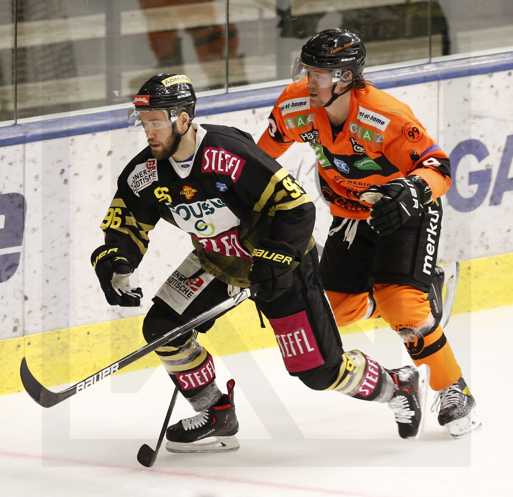 GRAZ, AUSTRIA, 15.Feb. 2022 – Moser Medical Graz 99ers vs. spusu Vienna Capitals. Image shows Nikolaus HARTL #96 (spusu Vienna Capitals) & Carl ACKERED #8 (Moser Medical Graz 99ers). Photo: Werner Krainbucher