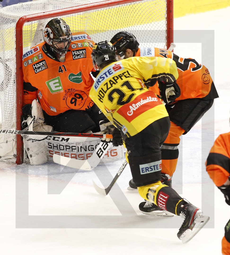 GRAZ, AUSTRIA, 06.Mar. 2020 – Viertelfinale, Spiel 2; Moser Medical Graz 99ers vs. spusu Vienna Capitals. Image shows Cristopher NIHLSTORP #41 (Moser Medical Graz 99ers), Riley HOLZAPFEL #21 (spusu Vienna Capitals) & Trevor HAMILTON #55 (Moser Medical Graz 99ers). Photo: Werner Krainbucher