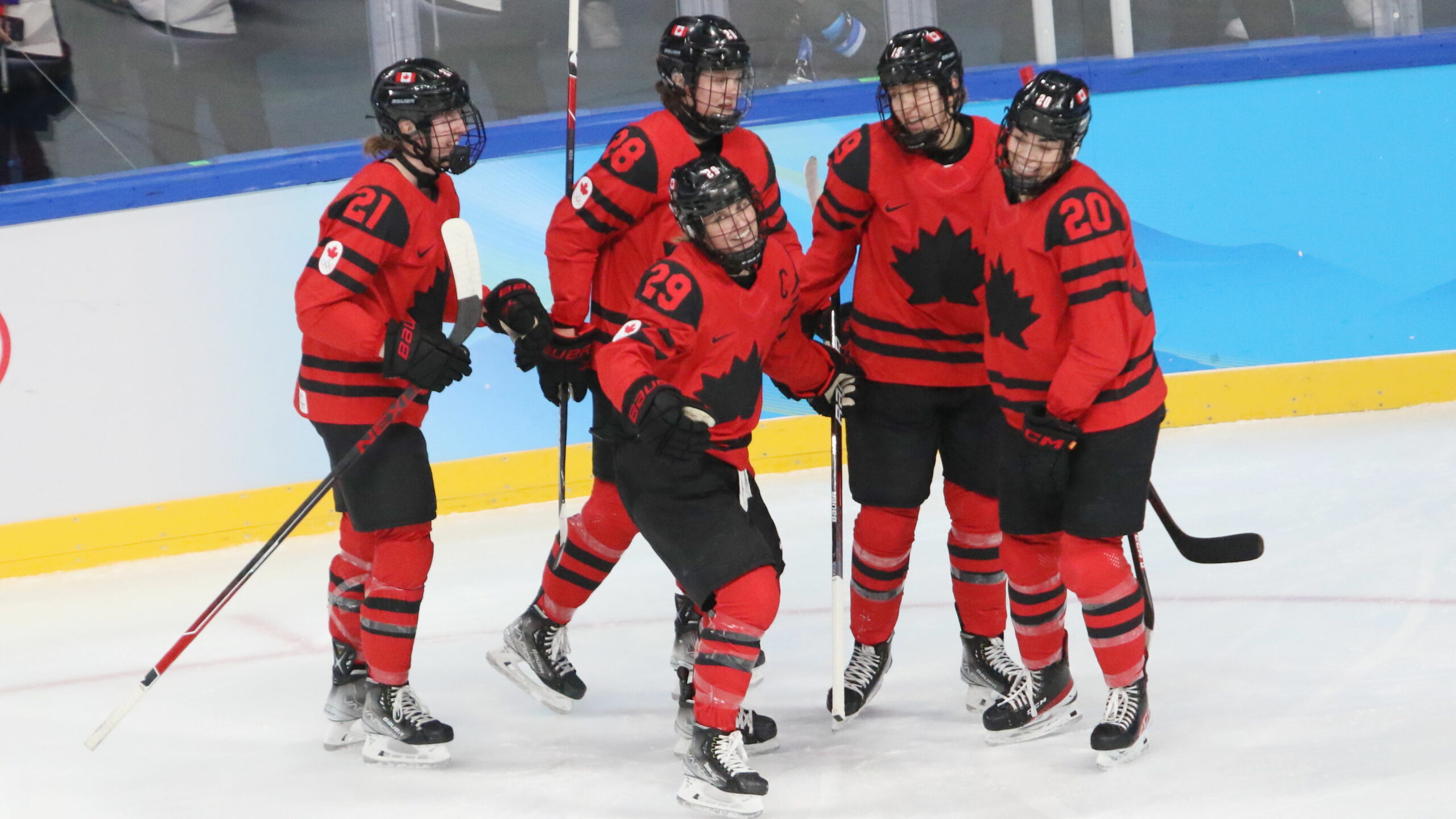 Ashton Bell #21, Micah Zandee-Hart #28, Marie-Philip Poulin #29, Brianne Jenner #19, Sarah Nurse #20, Marie-Philip Poulin #29