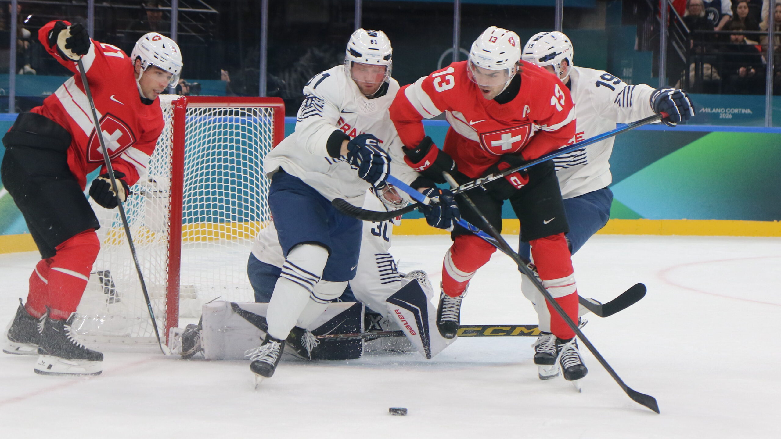 a6T4A7230 12. Februar 2026 2560 × 1440 Photo Gallery Olympic Games 2026 Mens Hockey SUI – FRA 4:0 Kevin Fiala #21, Anthony Rech #81, Nico Hischier #13, Enzo Cantagallo #19, Olympic Games 2026 Mens Hockey SUI – FRA, Milano Santa Giulia Arena, © Puckfans.at / Andreas Robanser