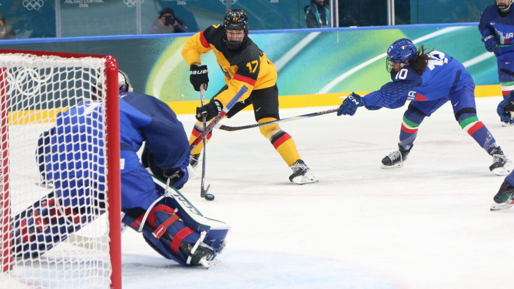 Nadia Mattivi #93, Gabriella Durante #1, Kristin Della Rovere #19, Lilli Welcke #23, Olympic Games 2026 Womens Hockey ITA – GER, Milano Rho Ice Park, © Puckfans.at / Andreas Robanser