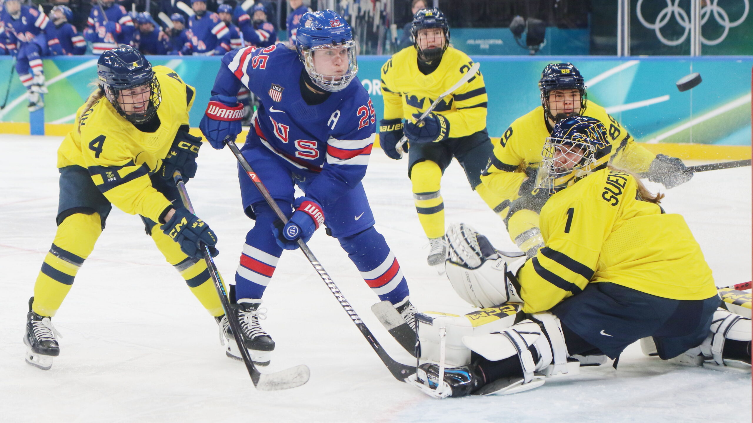 Linnéa Andersson #4, Alex Carpenter #25, Lina Ljungblom #25, Jessica Adolfsson #9, Ebba Svensson Träff #1, Olympic Games 2026 Womens Semifinal USA – SWE, Santa Giulia Arena, Milano © Puckfans.at / Andreas Robanser