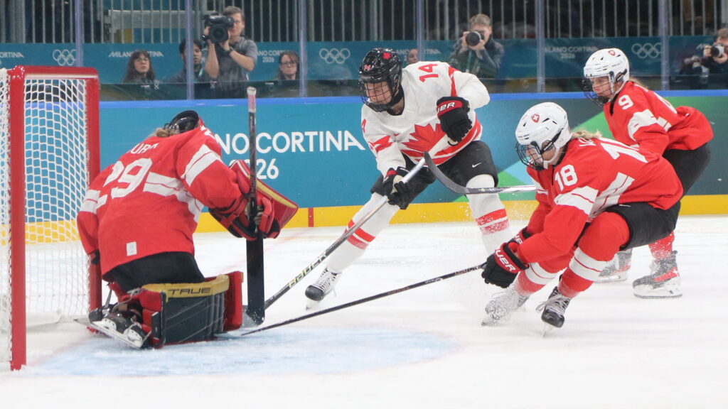 Alina Müller #25, Erin Ambrose #23, Brianne Jenner #19, Ella Shelton #17, Olympic Games 2026 Womens Hockey SUI – CAN, Milano Rho Ice Park, © Puckfans.at / Andreas Robanser