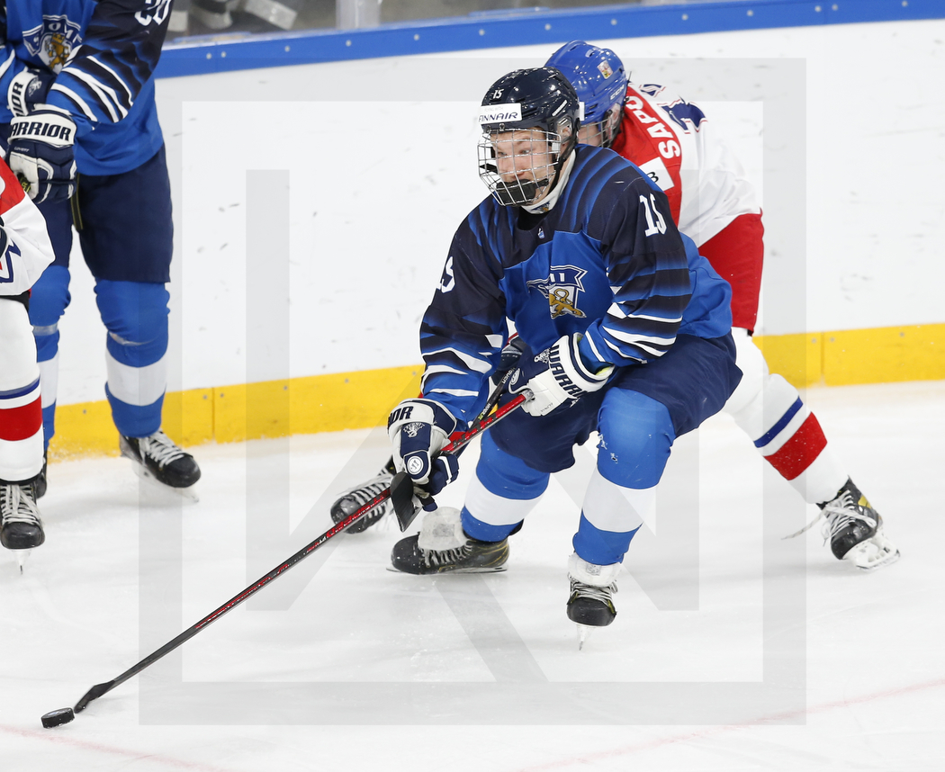 WK20220501_0074 1. Mai 2022 1050 × 858 PHOTO GALLERY: U18 IIHF World Championship, Bronze Medal Game, FIN-CZE 4:1 LANDSHUT, GERMANY, 01.May. 2022 – FIN vs. CZE. Image shows Tuomas URONEN #15 (Finland) & Matyas SAPOVALIV #15 (Czech Republic). Photo: Werner Krainbucher