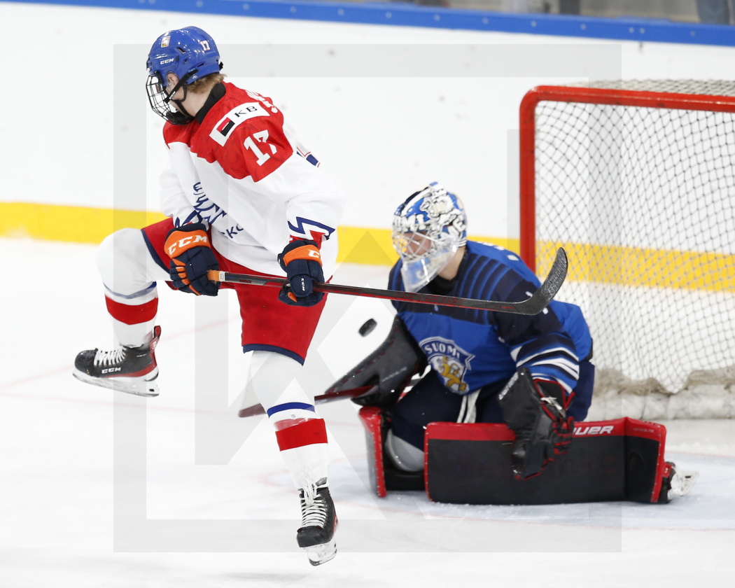 WK20220501_0105 1. Mai 2022 1050 × 840 PHOTO GALLERY: U18 IIHF World Championship, Bronze Medal Game, FIN-CZE 4:1 LANDSHUT, GERMANY, 01.May. 2022 – FIN vs. CZE. Image shows Simon SLAVICEK #17 (Czech Republic) & Topias LEINONEN #1 (Finland). Photo: Werner Krainbucher