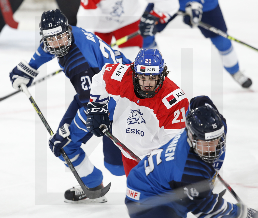 WK20220501_0120 1. Mai 2022 1050 × 888 PHOTO GALLERY: U18 IIHF World Championship, Bronze Medal Game, FIN-CZE 4:1 LANDSHUT, GERMANY, 01.May. 2022 – FIN vs. CZE. Image shows Samu BAU #21 (Finland), Ondrej BECHER #21 (Czech Republic) & Tuomas URONEN #15 (Finland). Photo: Werner Krainbucher