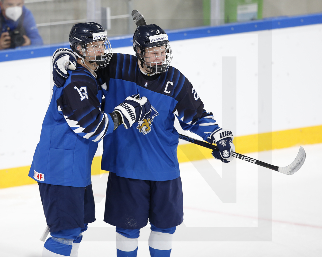 WK20220501_0142 1. Mai 2022 1050 × 838 PHOTO GALLERY: U18 IIHF World Championship, Bronze Medal Game, FIN-CZE 4:1 LANDSHUT, GERMANY, 01.May. 2022 – FIN vs. CZE. Image shows Joakim KEMELL #13 (Finland) & Jere LASSILA #28 (Finland) after the 1:1 tie. Photo: Werner Krainbucher