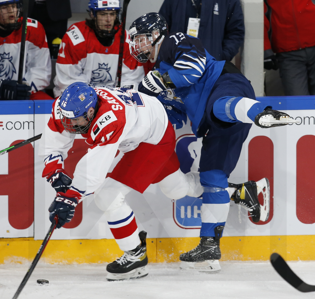 WK20220501_0185 1. Mai 2022 1050 × 996 PHOTO GALLERY: U18 IIHF World Championship, Bronze Medal Game, FIN-CZE 4:1 LANDSHUT, GERMANY, 01.May. 2022 – FIN vs. CZE. Image shows Matyas SAPOVALIV #15 (Czech Republic) & Joakim KEMELL #13 (Finland). Photo: Werner Krainbucher