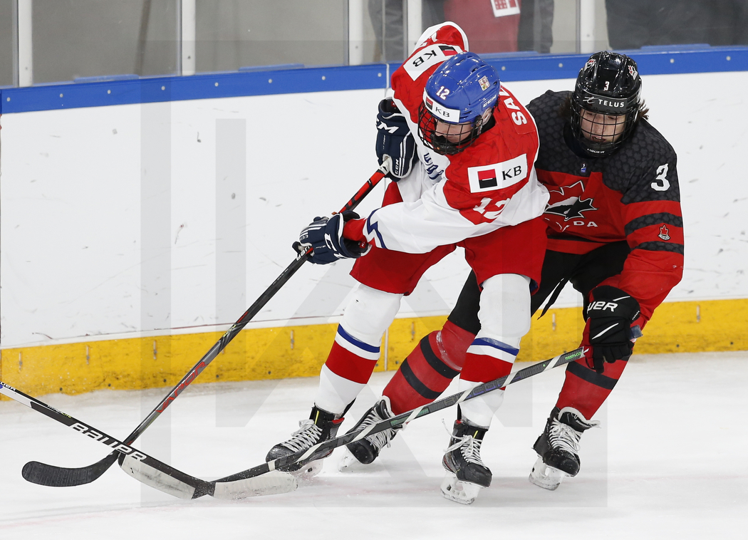 WK20220426_0736 26. April 2022 1050 × 758 PHOTO GALLERY: U18 IIHF World Championship, CAN-CZE 5:6 OT LANDSHUT, GERMANY, 26.Apr. 2022 – CAN vs. CZE . Image shows Eduard SALE #12 (Czech Republic) & Lukas DRAGICEVIC #3 (Canada). Photo: Werner Krainbucher