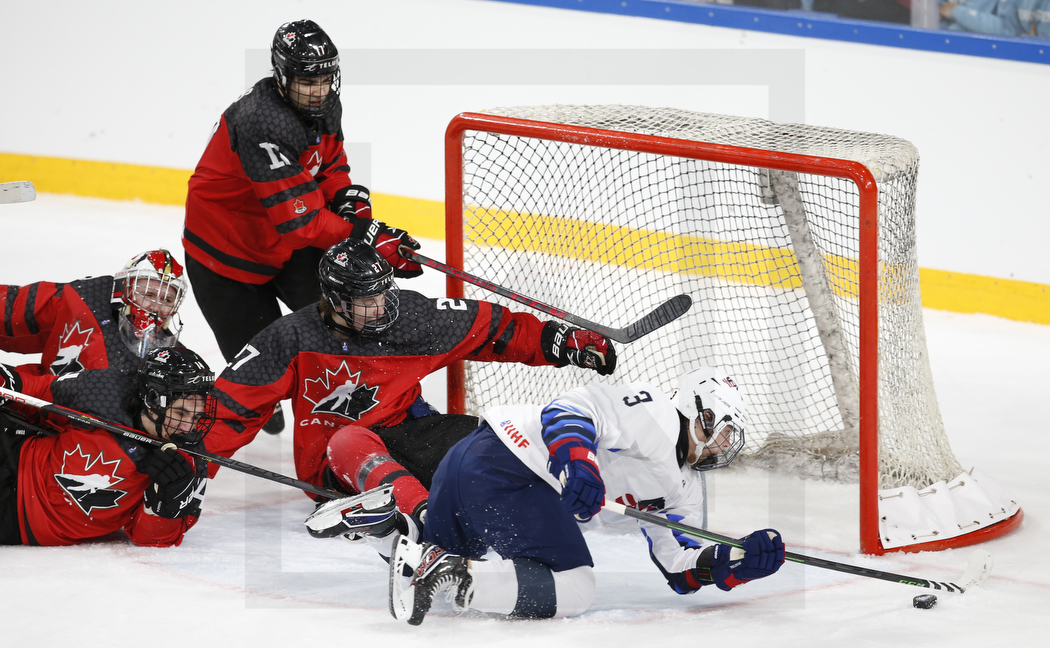 WK20220423_0598 23. April 2022 1050 × 648 PHOTO GALLERY: U18 IIHF World Championship, CAN – USA 3:8 LANDSHUT, GERMANY, 23.Apr. 2022 – CAN vs. USA. Image shows Reid DYCK #30 (Canada), Pano FIMIS #17 (Canada), Owen PICKERING #27 (Canada) & Isaac HOWARD #3 (USA). Photo: Werner Krainbucher