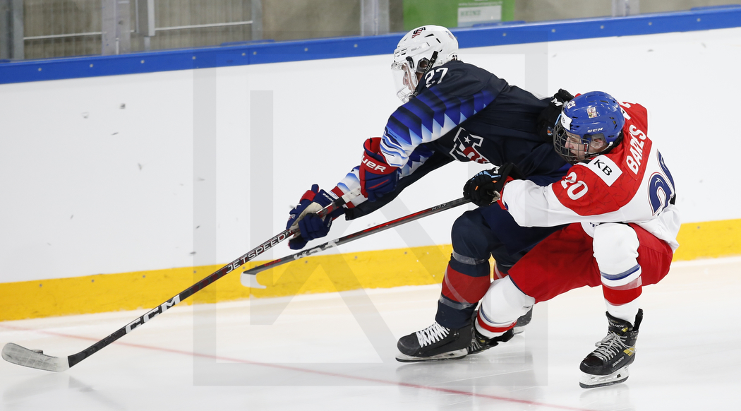 LANDSHUT, GERMANY, 24.Apr. 2022 – USA vs. CZE. Image shows Ryan CHESLEY #27 (USA) & Adam BARES #20 (Czech Republic). Photo: Werner Krainbucher