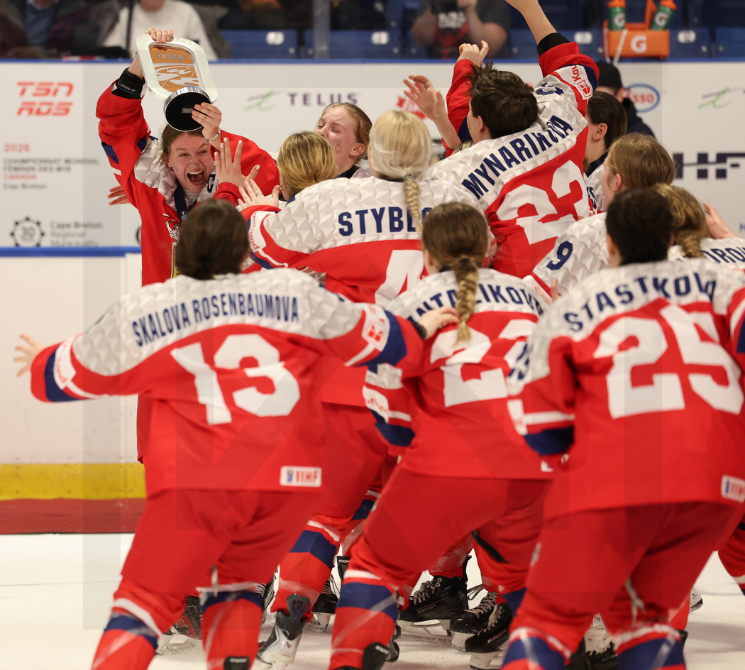 SYDNEY, CANADA, 18, Jan, 2026, U18 Woman’s Worlds, Bronze Medal Game, CZE vs. SWE. Image shows Czech girls with their trophy. Photo: Werner Krainbucher