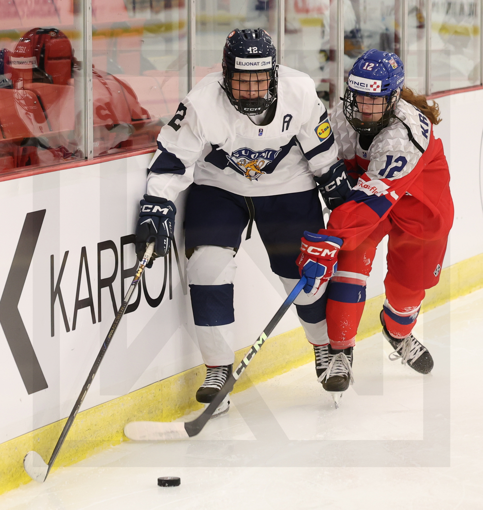 MEMBERTOU, CANADA, 10, Jan, 2026, U18 Woman’s Worlds, CZE vs. FIN. Image shows Viivi-Mija RUONAKOSKI #12 (Finland) & Adela KRENKOVA #12 (Czech Republic). Photo: Werner Krainbucher