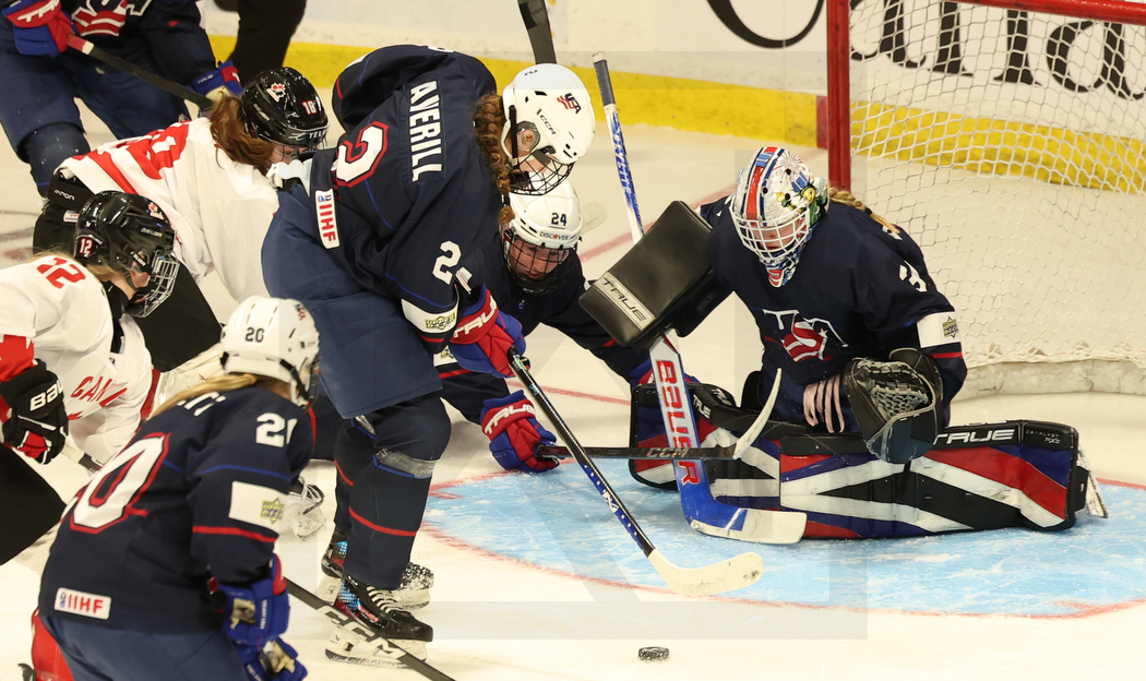 SYDNEY, CANADA, 18, Jan, 2026, U18 Woman’s Worlds, Gold Medal Game, USA vs. CAN. Image shows Maggie HUGHSON #12 (Canada), Alaina GNETZ #20 (USA), Kendall DOIRON #18 (Canada), Margaret AVERILL #2 (USA), Catherine MCCOOL #24 (USA) & Bianca BIRRITTIERI #31 (USA). Photo: Werner Krainbucher