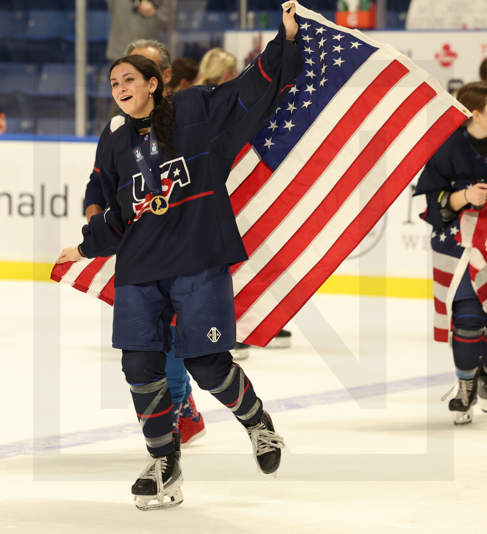WK20260118_1914 19. Januar 2026 958 × 1050 PHOTO GALLERY U18 WOMAN’S WORLDS GOLD MEDAL GAME USA-CAN 2:0 SYDNEY, CANADA, 18, Jan, 2026, U18 Woman’s Worlds, Gold Medal Game, USA vs. CAN. Image shows USA girl with the national flag. Photo: Werner Krainbucher