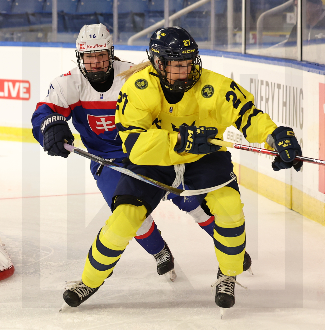 SYDNEY, CANADA, 15, Jan, 2026, U18 Woman’s Worlds, Quarterfinal, SWE vs. SVK. Image shows Nina ROSTECKA #16 (Slovakia) & Maja AKERLUND #27 (Sweden). Photo: Werner Krainbucher
