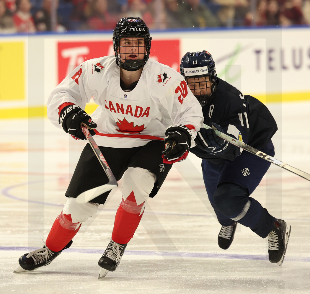 SYDNEY, CANADA, 15, Jan, 2026, U18 Woman’s Worlds, Quarterfinal, CAN vs. FIN. Image shows Kate VIEL #28 (Canada) & Aino LEHIKOINEN #11 (Finland). Photo: Werner Krainbucher