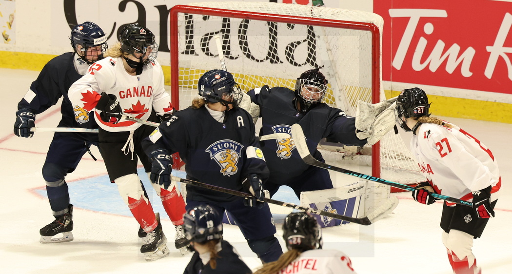 SYDNEY, CANADA, 15, Jan, 2026, U18 Woman’s Worlds, Quarterfinal, CAN vs. FIN. Image shows Iida ELOMAA #2 (Finland), Maggie HUGHSON #12 (Canada), Viivi-Mija RUONAKOSKI #12 (Finland), Eerika KUJALA #31 (Finland) & Jaylee MACKINNON #27 (Canada). Photo: Werner Krainbucher