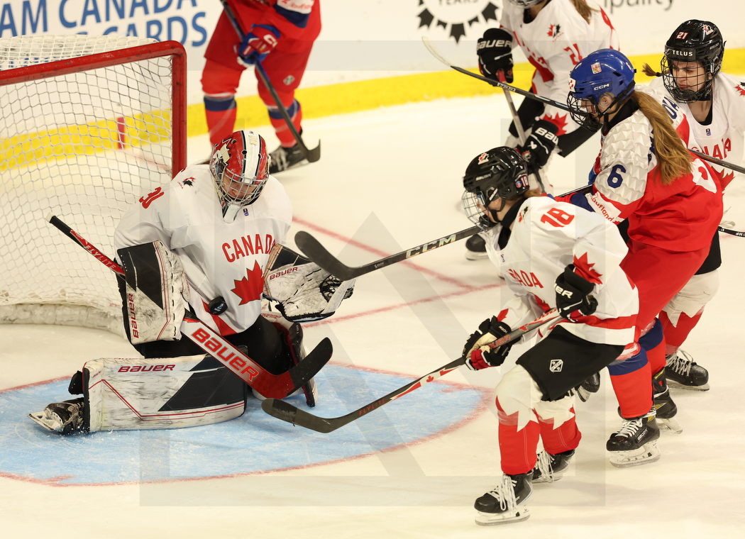 SYDNEY, CANADA, 17, Jan, 2026, U18 Woman’s Worlds, Semifinals, CAN vs. CZE. Image shows Lea-Rose CHARROIS #30 (Canada), Kendall DOIRON #18 (Canada), Dana BREZINOVA #6(Czech Republic) & Avery JONES #21 (Canada). Photo: Werner Krainbucher