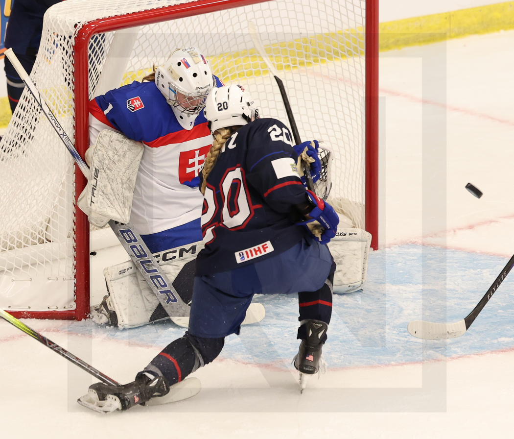 MEMBERTOU, CANADA, 10, Jan, 2026, U18 Woman’s Worlds, SVK vs. USA. Image shows Zuzana TOMECKOVA #1 (Slovakia) & Alaina GNETZ #20 (USA). Photo: Werner Krainbucher