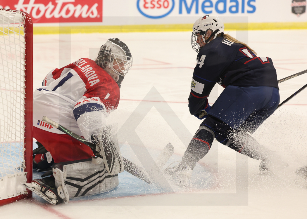 MEMBERTOU, CANADA, 11, Jan, 2026, U18 Woman’s Worlds, USA vs. CZE. Image shows Lili CHMELAROVA #1 (Czech Republic) & Talla HANSEN #14 (USA). Photo: Werner Krainbucher
