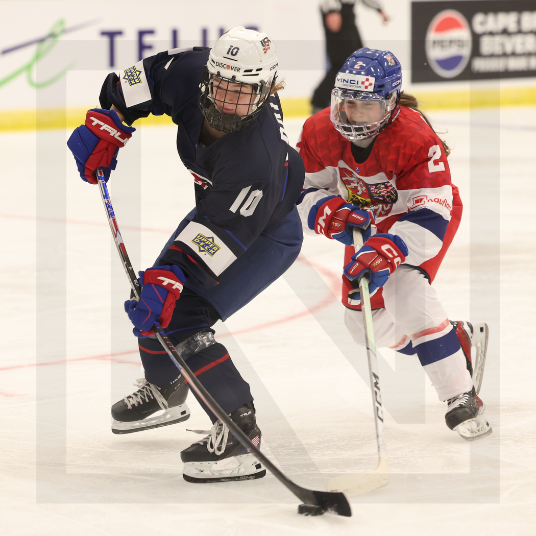 MEMBERTOU, CANADA, 11, Jan, 2026, U18 Woman’s Worlds, USA vs. CZE. Image shows Jane DALEY #10 (USA) & Klara SRAMKOVA #2 (Czech Republic). Photo: Werner Krainbucher