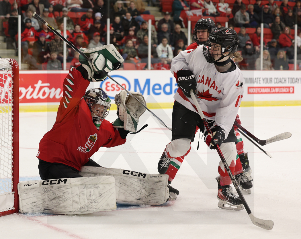 MEMBERTOU, CANADA, 12, Jan, 2026, U18 Woman’s Worlds, CAN vs. HUN. Image shows Zoe TAKACS #1 (Hungary) & Rachel PIGGOTT #17 (Canada). Photo: Werner Krainbucher