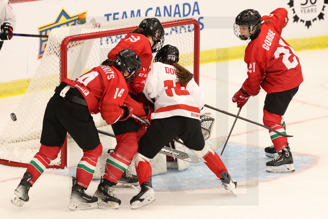 MEMBERTOU, CANADA, 12, Jan, 2026, U18 Woman’s Worlds, CAN vs. HUN. Image shows Reka KERKOVITS #14 (Hungary), Bibirka SIMON #23 (Hungary), Kendall DOIRON #18 (Canada) & Liza GORBE #21 (Hungary). Photo: Werner Krainbucher