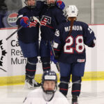 MEMBERTOU, CANADA, 13, Jan, 2026, U18 Woman’s Worlds, USA vs. FIN. Image shows Talla HANSEN #14 (USA), usa19 & Taylee MANION #28 (USA) with a goal celebration. Photo: Werner Krainbucher