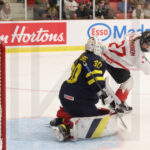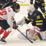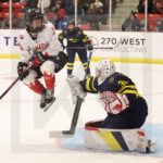 MEMBERTOU, CANADA, 13, Jan, 2026, U18 Woman’s Worlds, CAN vs. SWE. Image shows Adrianna MILANI #20 (Canada) & Thea HOLMBERG #30 (Sweden) looking for the puck in the air. Photo: Werner Krainbucher