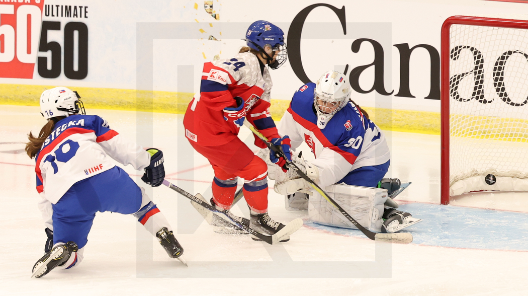 MEMBERTOU, CANADA, 13, Jan, 2026, U18 Woman’s Worlds, CZE vs. SVK. Image shows Nina ROSTECKA #16 (Slovakia), Adela PANKOVA #24 (Czech Republic) & Mariana SUMEGOVA #30 (Slovakia). Photo: Werner Krainbucher