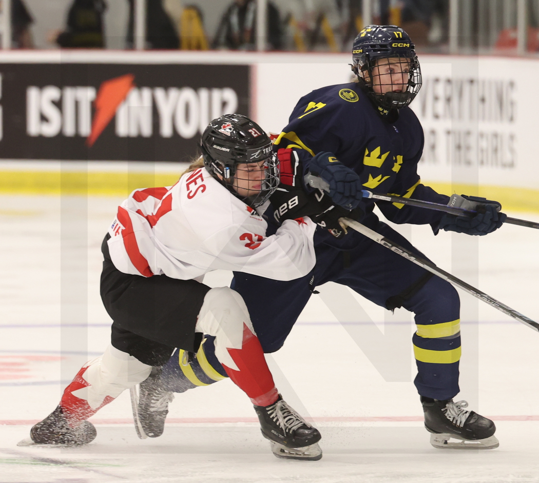 MEMBERTOU, CANADA, 13, Jan, 2026, U18 Woman’s Worlds, CAN vs. SWE. Image shows Avery JONES #21 (Canada) & Tilia LINDGREN #17 (Sweden). Photo: Werner Krainbucher