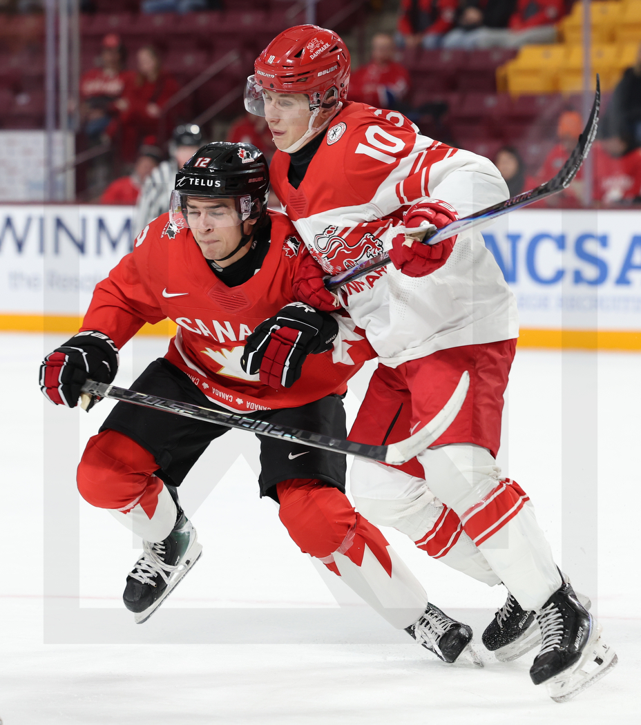 MINNEAPOLIS, USA, 29, Dec, 2025, World Juniors, CAN vs. DEN. Image shows Carter BEAR #12 (Canada) & Sebastian STROMSTAD #10 (Denmark). Photo: Werner Krainbucher (Puckfans.at)