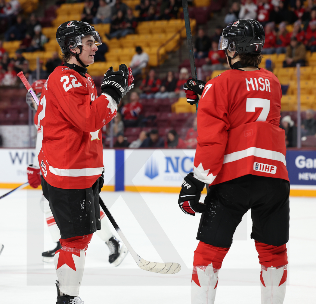 MINNEAPOLIS, USA, 29, Dec, 2025, World Juniors, CAN vs. DEN. Image shows Porter MARTONE #22 (Canada) & Michael MISA #7 (Canada). Photo: Werner Krainbucher (Puckfans.at)