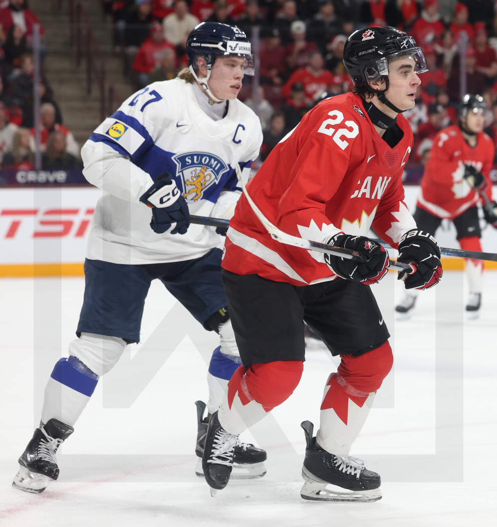 MINNEAPOLIS, USA, 31, Dec, 2025, World Juniors, CAN vs. FIN. Image shows Julius MIETTINEN #27 (Finland) & Porter MARTONE #22 (Canada). Photo: Werner Krainbucher (Puckfans.at)