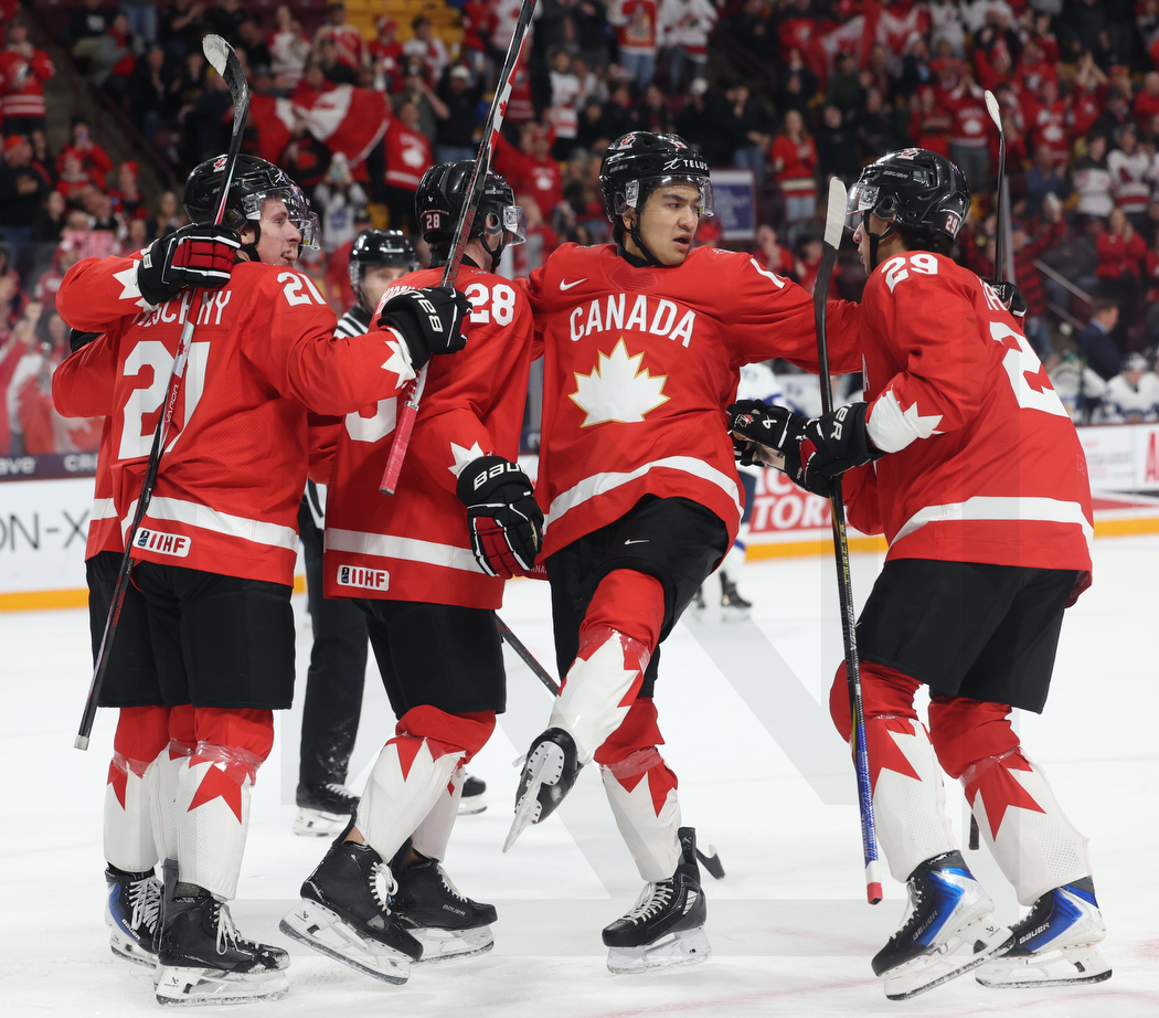 WK20251231_0794 1. Januar 2026 1050 × 922 PHOTO GALLERY WORLD JUNIORS 2026 CAN – FIN 7:4 MINNEAPOLIS, USA, 31, Dec, 2025, World Juniors, CAN vs. FIN. Image shows goal celebration Canada. Photo: Werner Krainbucher (Puckfans.at)
