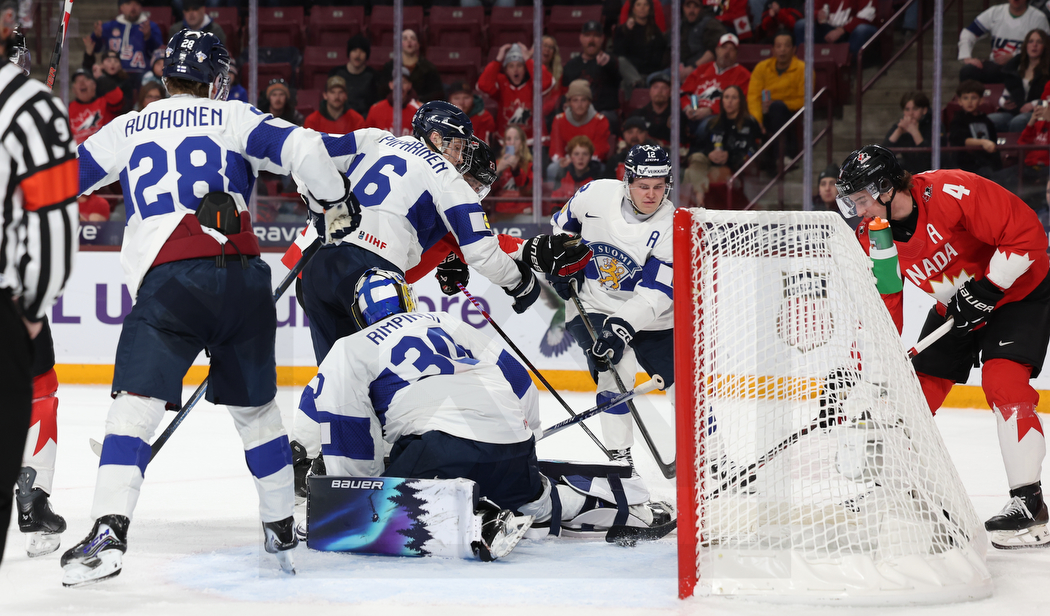 MINNEAPOLIS, USA, 31, Dec, 2025, World Juniors, CAN vs. FIN. Image shows Heikki RUOHONEN #28 (Finland), Juho PIIPARINEN #6 (Finland), Petteri RIMPINEN #30 (Finland), Joona SAARELAINEN #12 (Finland) & Harrison BRUNICKE #4 (Canada). Photo: Werner Krainbucher (Puckfans.at)