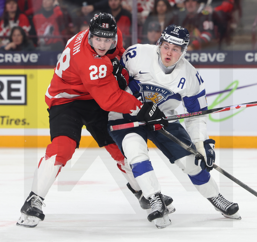 MINNEAPOLIS, USA, 31, Dec, 2025, World Juniors, CAN vs. FIN. Image shows Brady MARTIN #28 (Canada) & Joona SAARELAINEN #12 (Finland). Photo: Werner Krainbucher (Puckfans.at)