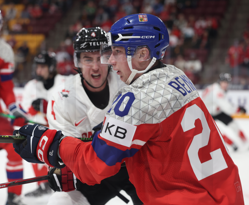 WK20251226_1872 27. Dezember 2025 1050 × 864 PHOTO GALLERY WORLD JUNIORS 2026 CZE -CAN 5:7 MINNEAPOLIS, USA, 26, Dec, 2025, World Juniors, CZE vs. CAN. Image shows Harrison BRUNICKE #4 (Canada) & Adam BENAK #20 (Czech Republic). Photo: Werner Krainbucher (Puckfans.at)
